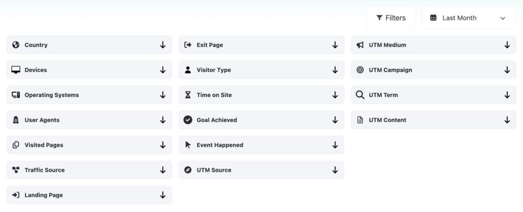 All reports in Must-Have Analytics are fully filterable. Each report includes a dedicated filter panel that allows data to be narrowed down based on visitor attributes, behavior, traffic sources, and business-related conditions. This makes it possible to analyze the same report from multiple perspectives without duplicating reports or exporting data first.